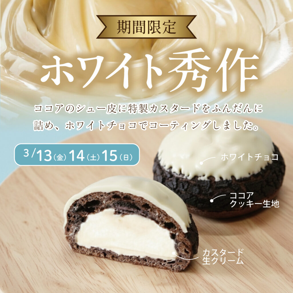 ココアを練りこんだ香ばしいシュー生地に、濃厚なでなめらかなカスタードクリームをたっぷりと。仕上げにホワイトチョコレートで丁寧にコーティングしました。口に入れた瞬間、サクッとした食感ととろけるクリーム、そしてホワイトチョコの深いコクが一体となる、ちょっと贅沢なひとときをお届けいたします。