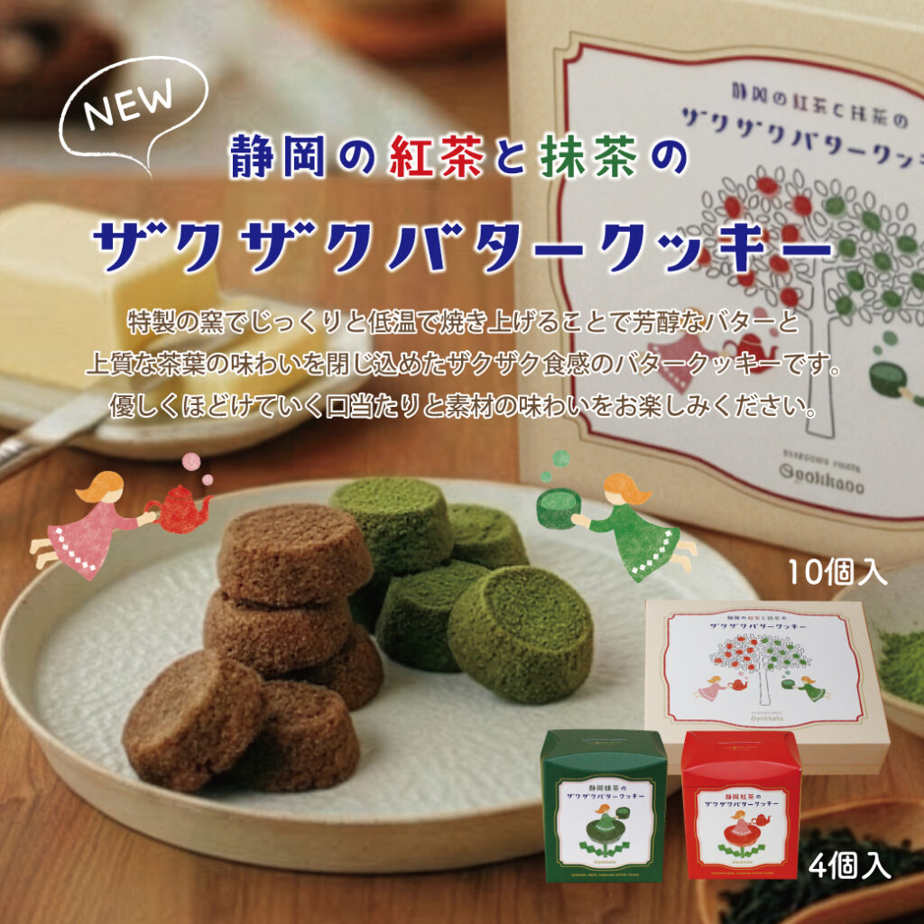 特製の窯でじっくりと低温で焼き上げることで芳醇なバターと上質な茶葉の味わいを閉じ込めたザクザク食感のバタークッキー。お茶所、静岡県産の紅茶と抹茶を使用し、香り豊かに焼きあげました。