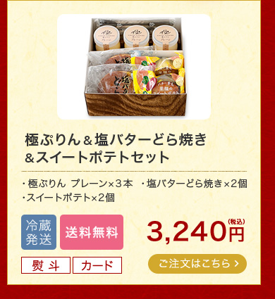人気極ぷりん・塩バターどら焼き・スイートポテトの詰め合わせ 【送料無料】極プリン3個・塩バターどら焼き2個・スイートポテト2個セット ギフト箱入