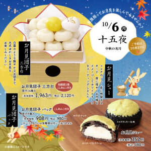 10月5日、6日の2日間、お月見商品を販売いたします。 もっちり「すあま団子」でお作りした【お月見団子】おいしすぎてあっ!という間になくなる美味しさです♪【お月見秀作】はココアのシュー皮に玉華堂自慢の特製カスタードをお詰めし、夜に煌めくお月様をイメージしてホワイトチョコでコーティングしました。 2日間の限定品、日本の四季を感じながら美味しいお菓子を召し上がってください♪ ※売り切れる場合がございます事前ご予約をお勧めいたします。 …(続きを読む)