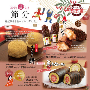 子供たちが毎年楽しみにしている節分。金棒をかたどった「鬼に金棒シュー」、トラ柄の鬼のパンツをイメージしてお作りした恵方ロール。大人の方には遠州地方で伝わる「ナタ餅」と厄除けのお菓子もご用意しております。 …(続きを読む)